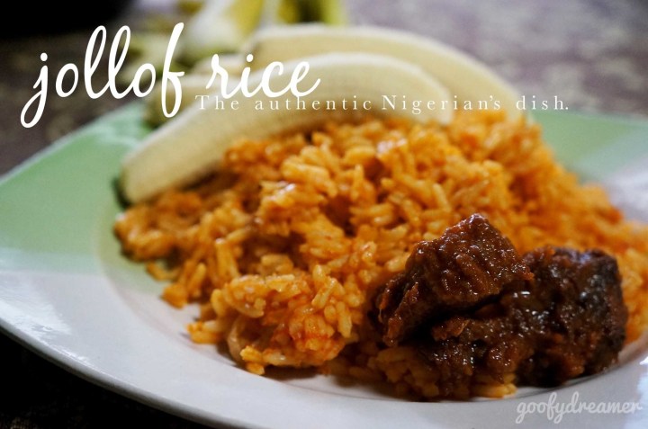 Jollof rice merupakan salah satu resep andalan bangsa Nigeria yang mirip sekali dengan nasi goreng. Resep ini mulanya berasal dari Gambia, kemudian menyebar ke beberapa negara di Afrika Tengah seperti Liberia, Nigeria, dan Ghana. Etnis Wollof yang ditemukan di Gambia, Mauritania dan Senegal juga mengakui resep ini sebagai bagian dari menu asli mereka. Etnis Wollof menyebut Jollof Rice ‘Benachin’ yang artinya ‘satu pot’ sesuai dengan cara menyajikannya nasi ini didalam baskom besar.